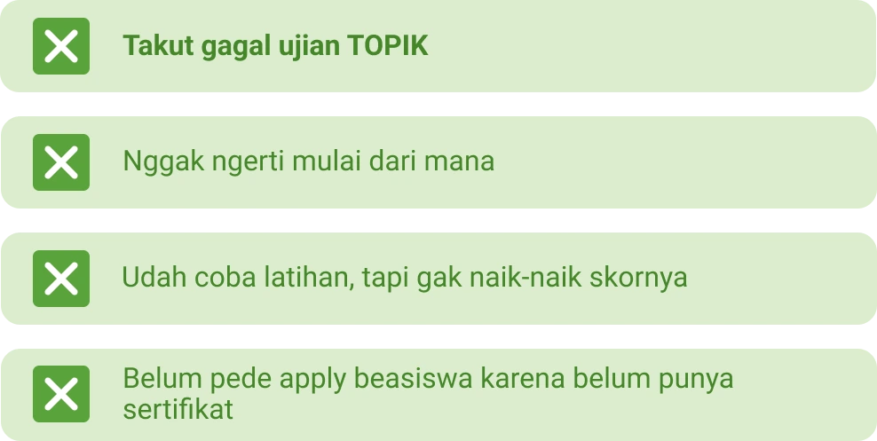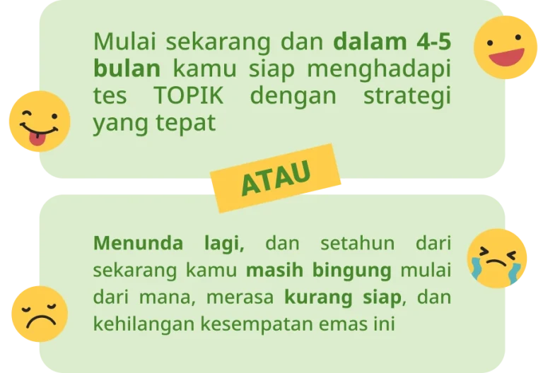 Disclaimer: Kelas Persiapan TOPIK ini tidak cocok untuk level pemula. Prasyarat mengikuti kelas ini adalah minimal harus sudah lulus level menengah (intermediate).